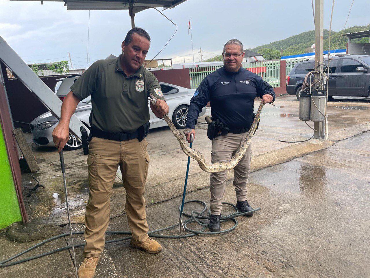 El sargento Randy Vargas Jiménez, director de la Liga Atlética Policiaca, del área de Arecibo, en unión al sargento Omar Reyes, del Departamento de Recursos Naturales, capturaron a la serpiente Boa Red Tail, de 6 pies, la cual se encontraba en la parte del tanque de gasolina del vehículo de un ciudadano, en el estacionamiento del ‘Ecolaundromat’, ubicado en la carretera 2 kilómetro 56.7, en el pueblo de Barceloneta.