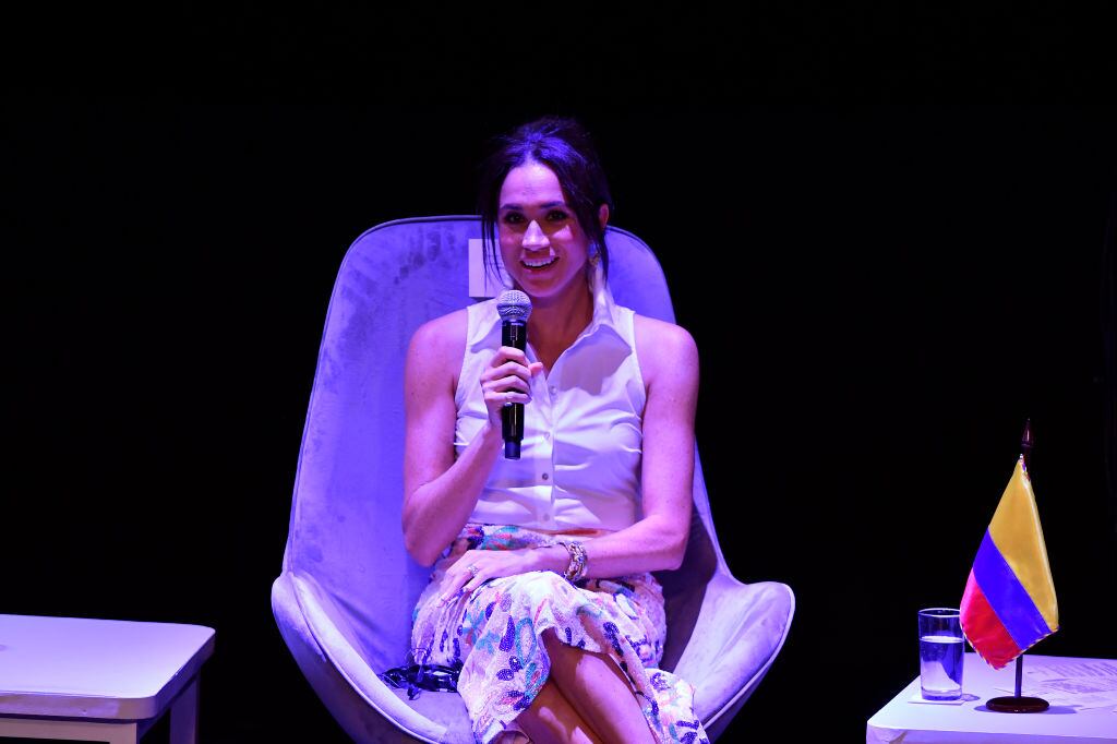 Meghan Markle habla en español durante el foro "Mujeres Afro y Poder" realizado en el Teatro Municipal de Cali, Colombia, el domingo 18 de agosto. (Gabriel Aponte/Getty Images)