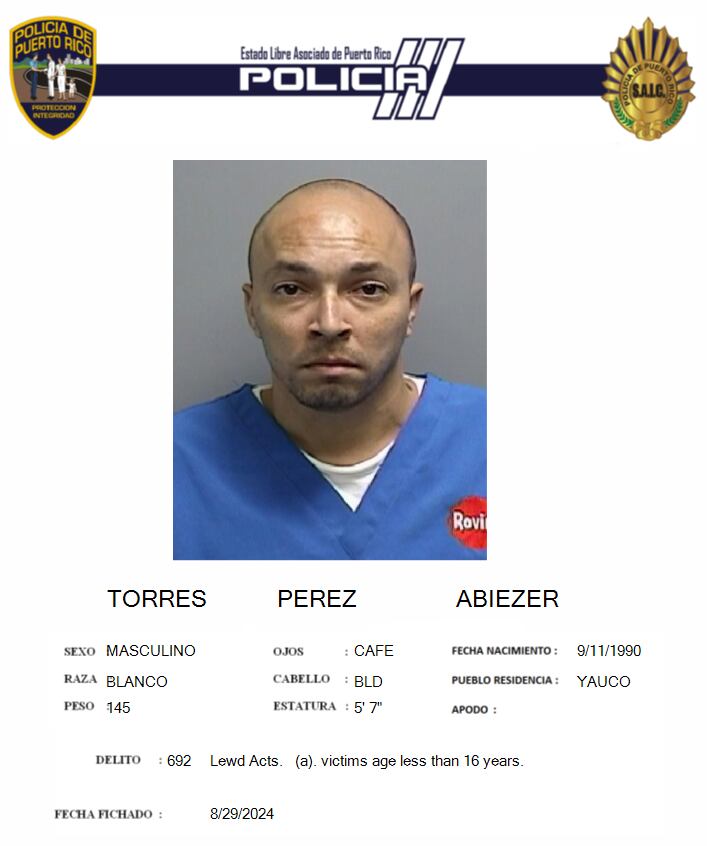 Agentes del Negociado de la Policía de Puerto Rico, adscritos a la División de Delitos Sexuales y Maltrato a Menores, del Cuerpo de Investigaciones Criminales (CIC) de Ponce, llevaron a cabo una investigación que culminó la tarde del jueves, 29 de agosto de 2024, en la presentación de cargos criminales, por parte de la fiscalía, contra un hombre, identificado como Abiezer Torres Pérez, de 33 años y residente de Yauco.