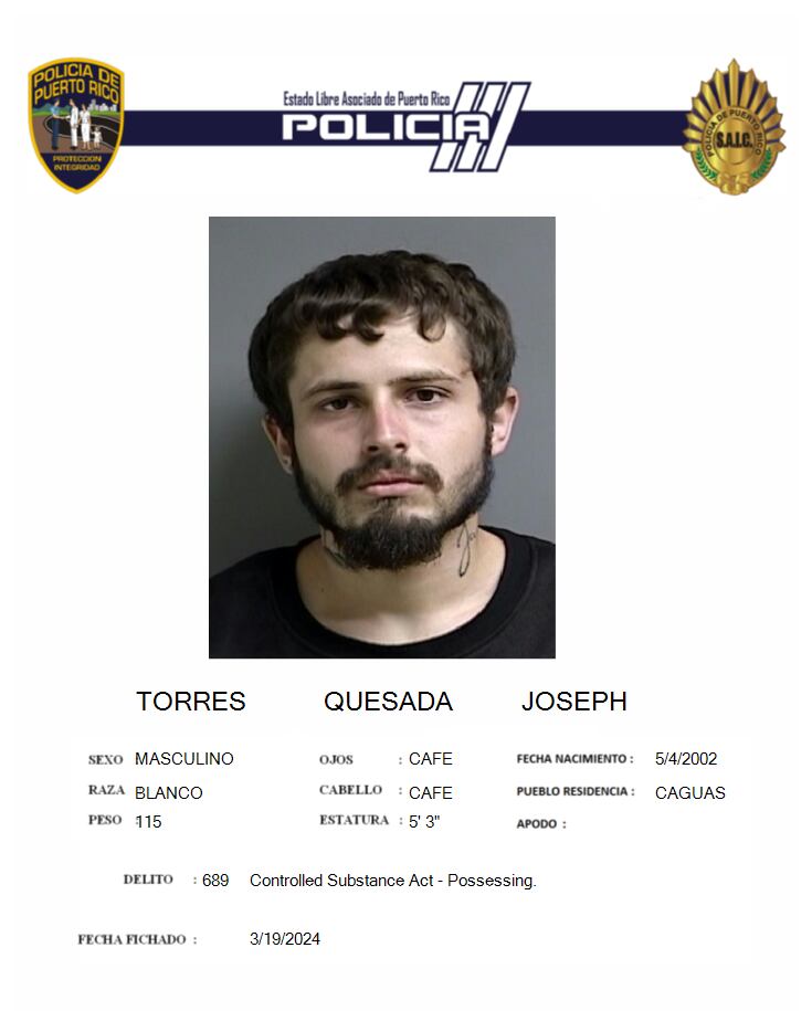 De acuerdo al reporte de la Uniformada, los agentes llegaron hasta el dicho complejo de vivienda a diligenciar una orden de arresto y cuando se encontraban ejecutando la misma, un hombre identificado como Joseph A. Torres Quesada, de 22 años y conocido como “Mueca”, integrante de la organización criminal “Los Viraos”, disparó contra los agentes y fue puesto bajo arresto.