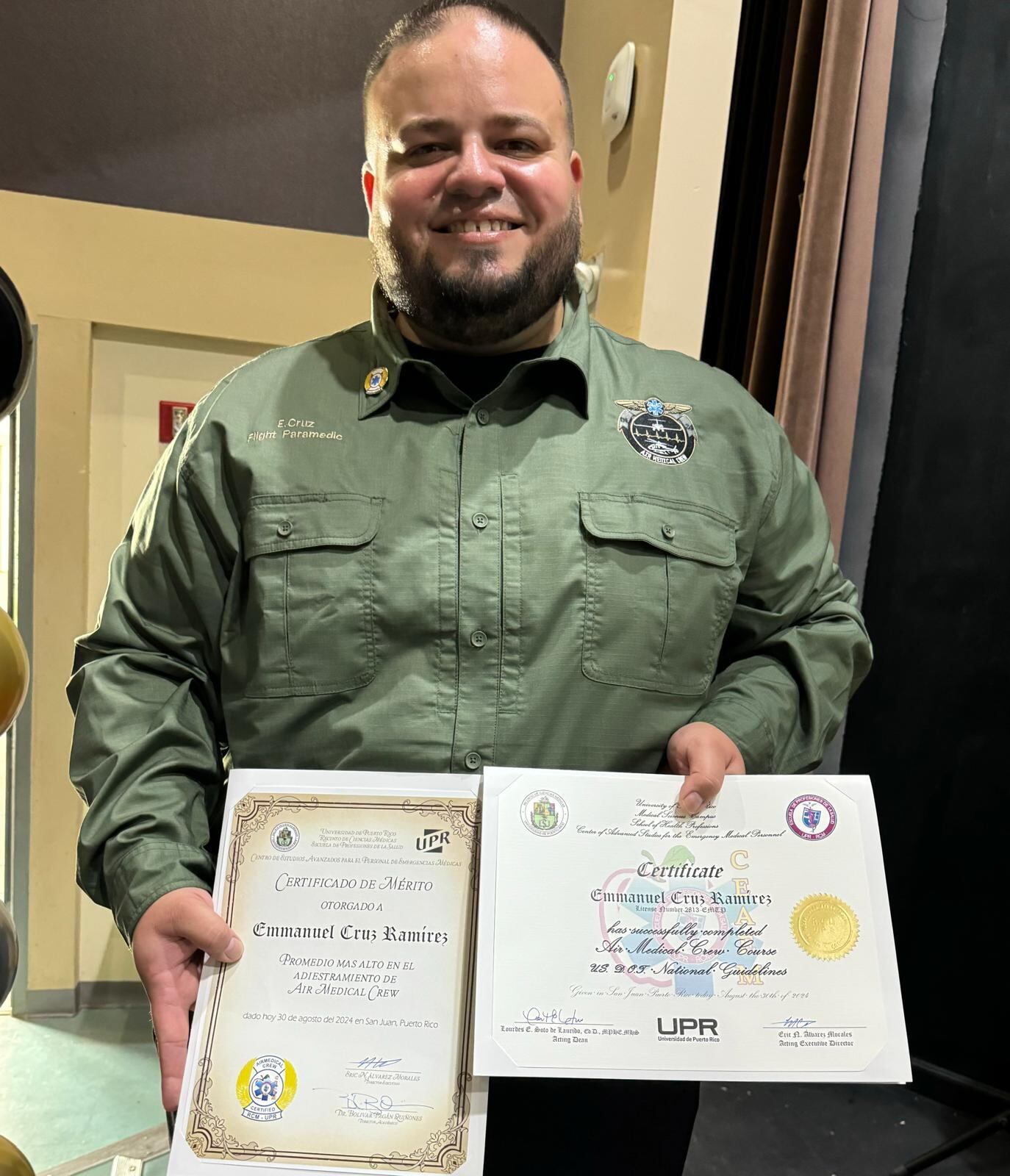 El discurso de graduación estuvo a cargo del paramédico Emmanuel Cruz, quien pasó el curso con la puntuación más alta. “Cada etapa del curso fue retante y gratificante”, dijo Cruz, hijo de un paramédico y también paramédico, con 12 años de experiencia. Asimismo, manifestó que su deseo de formar parte de un equipo de transporte aéreo surgió de niño, cuando observaba la activación de una ambulancia aérea y veía el helicóptero volando sobre su hogar, un objetivo que logró este año.