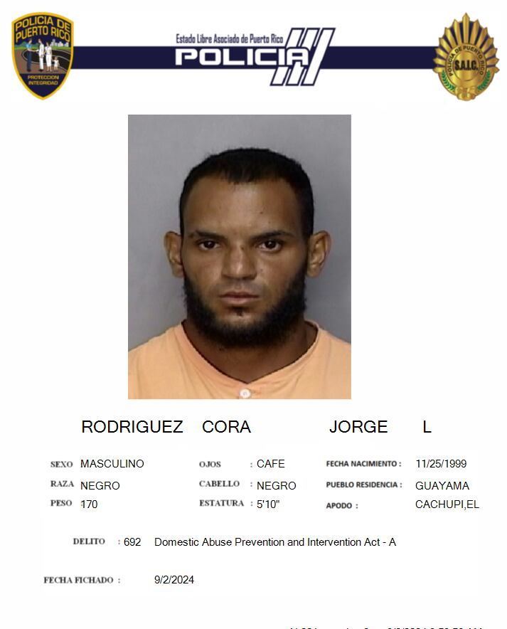 Agentes del Negociado de la Policía de Puerto Rico, adscritos a la División de Violencia de Género y Asuntos Juveniles, realizaron una investigación que culminó con la presentación de cargos, por parte de la Fiscalía, por Maltrato (artículo 3.1), de la Ley 54 de Violencia Doméstica, y Portación y uso de Armas Blancas (articulo 6.06) de la Ley de Armas, contra un hombre, identificado como Jorge Rodríguez Cora, de 24 años y residente de Guayama.