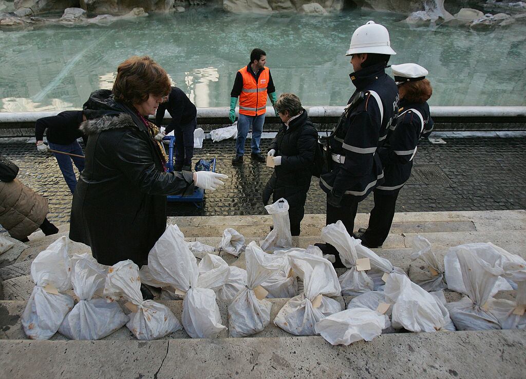The Passage Of A Trevi Fountain Coin ROME, ITALY - NOVEMBER 28: A Caritas employee counts bags of coins collected at the Trevi Fountain November 28, 2005 in Rome, Italy. Tourists from all over the world come to Rome's Trevi fountain to throw coins and make a wish. Once a week the coins, that are worth around $ 600, 000 a year, are collected, cleaned, weighed, enumerated and devolved from Rome's Municipality to Caritas, an International Catholic NGO (Non Governmental Organization) that use them to support a shelter that host twenty-five AIDS patients in Rome. Four cleaners in charge of collecting the coins were arrested on November 20, 2005 after being caught in possession of coins worth 1,200 euros. Police say the thieves may have pocketed as much as 110,000 euros during the course of the year. The fountain was built by the architect Salvi (1735) in the time of Pope Clement XII, and decorated by several artists of Bernini's school. (Photo by Marco Di Lauro/Getty Images) (Marco Di Lauro/Getty Images)