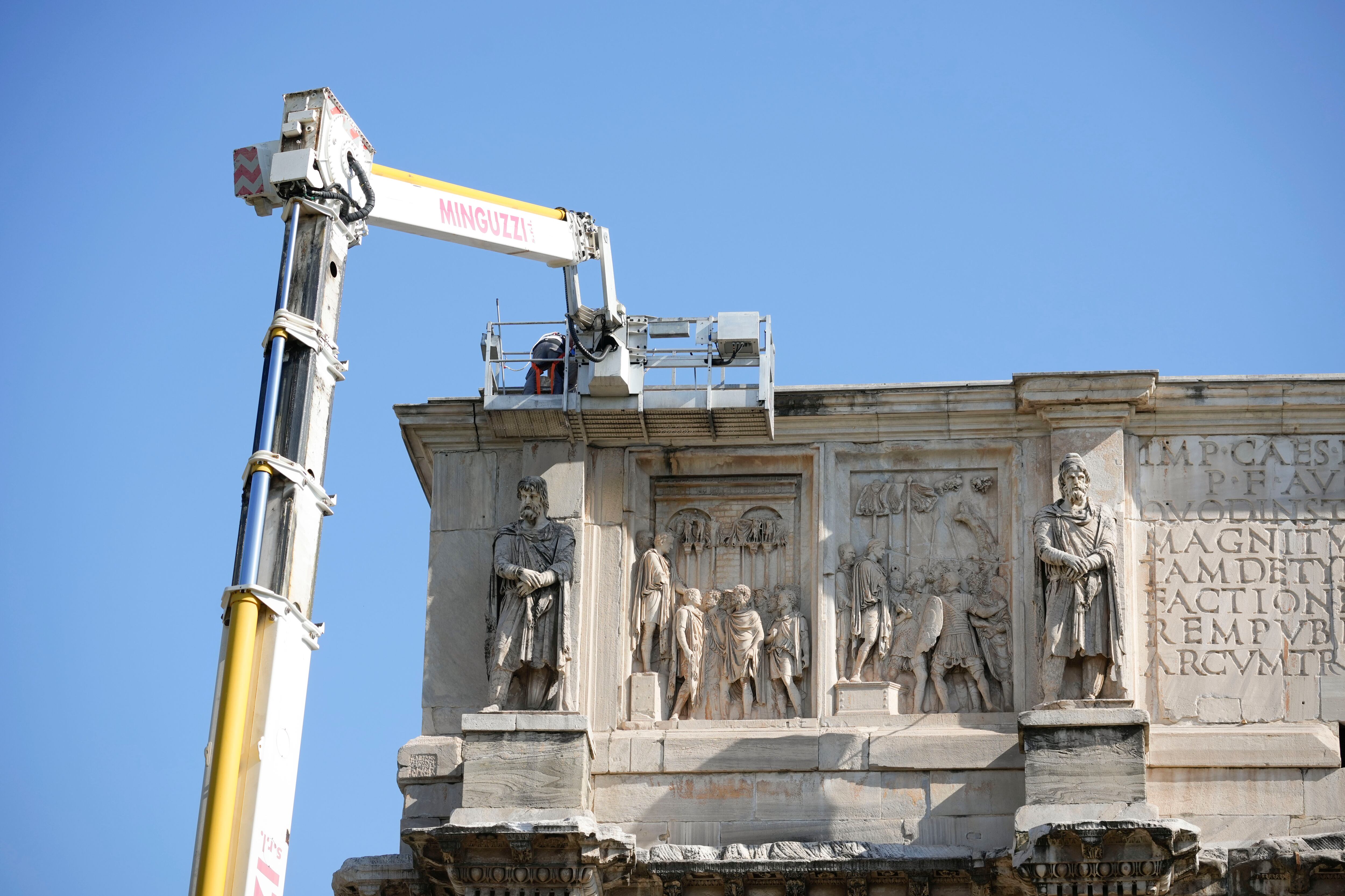El arco honorífico, de más de 20 metros (casi 70 pies) de alto, fue levantado en el año 315 d. C. para conmemorar la victoria del emperador Constantino sobre Majencio en la batalla del Puente Milvio.