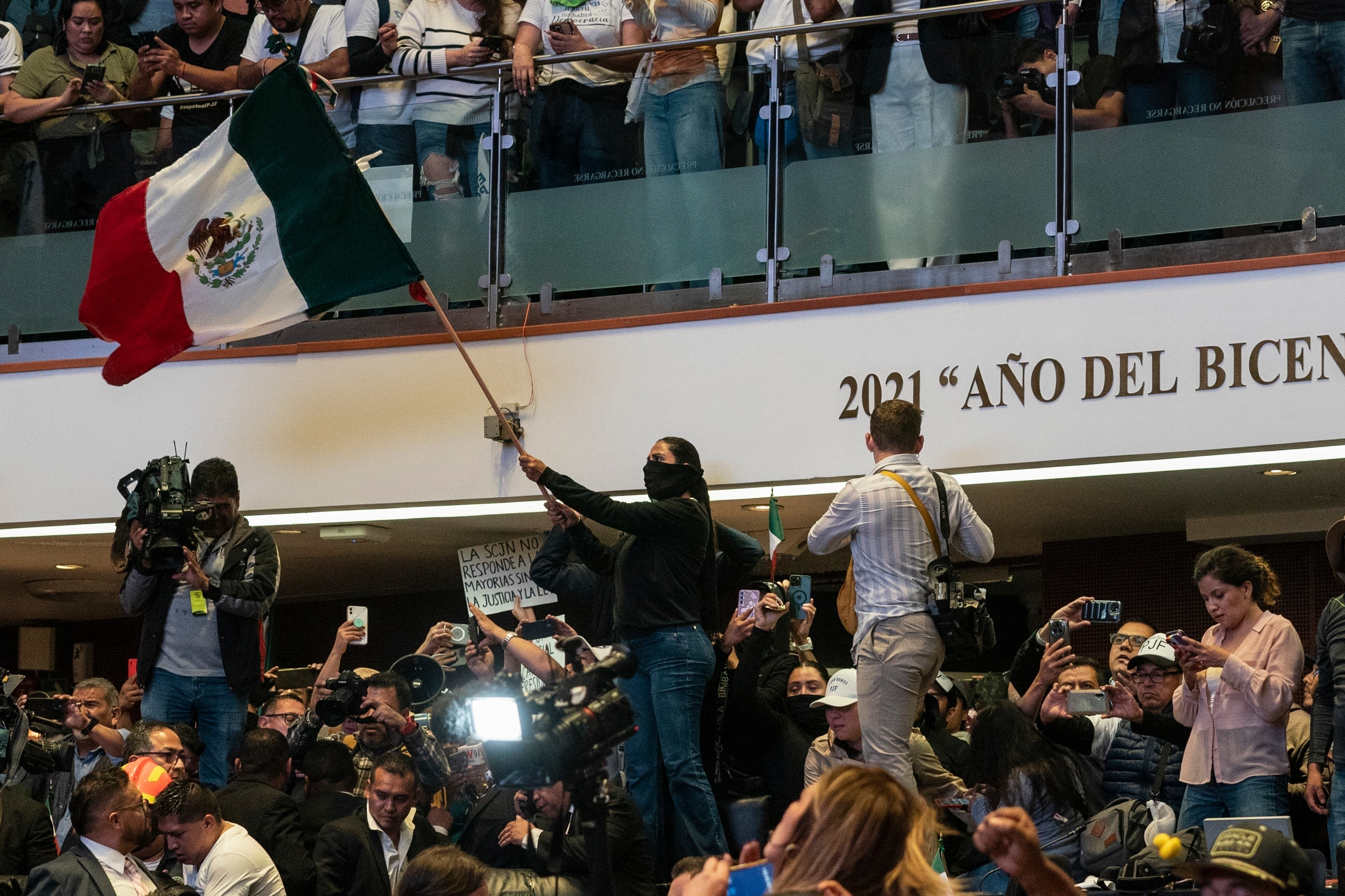 Los inconformes dijeron que los legisladores no estaban escuchando sus demandas. Ingresaron ondeando banderas de México y pancartas en contra de la reforma, y algunos senadores de la oposición se les sumaron mientras gritaban consignas dentro del Senado.