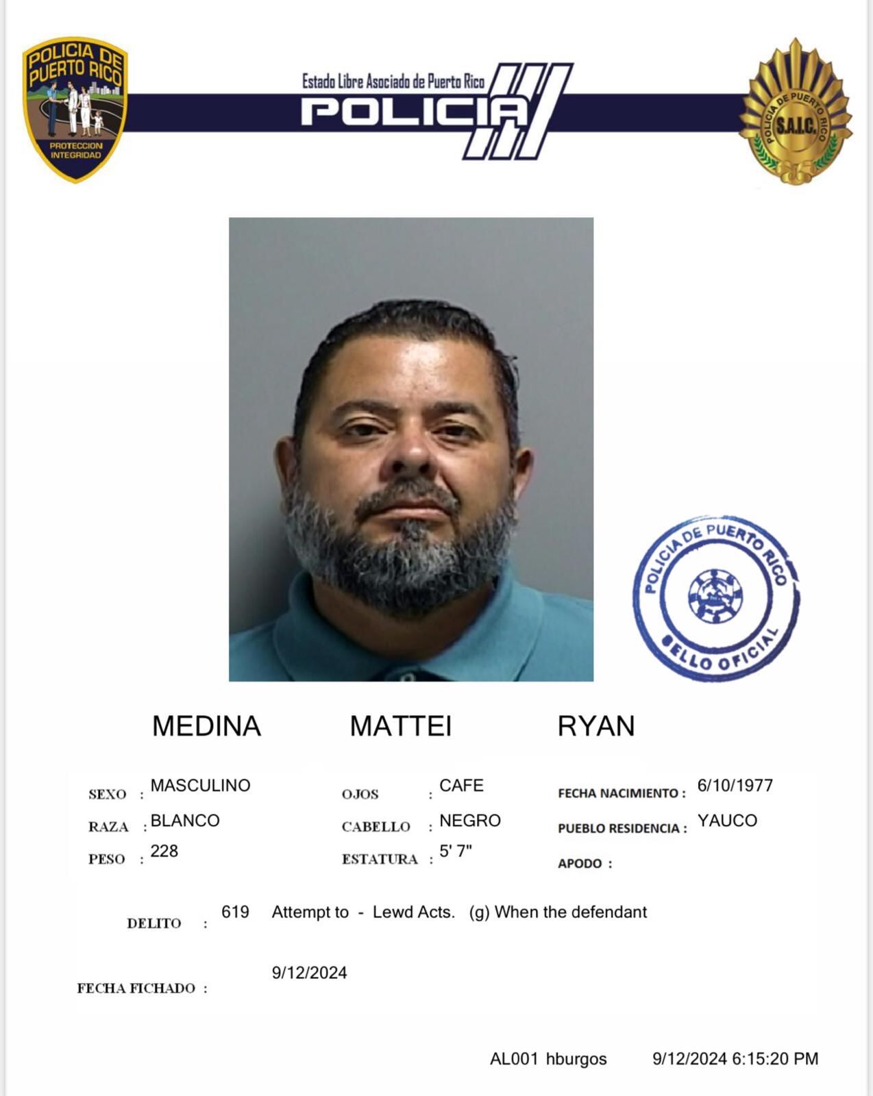 Las autoridades presentaron cargos criminales durante la tarde del jueves, 12 de septiembre de 2024, contra un hombre, identificado como Ryan Medina Mattei, de 47 años y residente de Yauco.