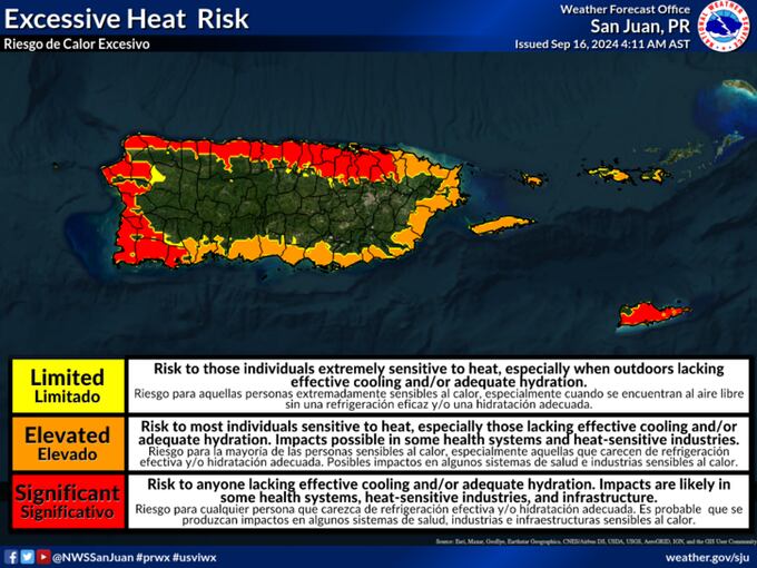 Las condiciones cálidas y húmedas continuarán con un riesgo elevado a significativo de calor, particularmente en las zonas de menor elevación de las islas.