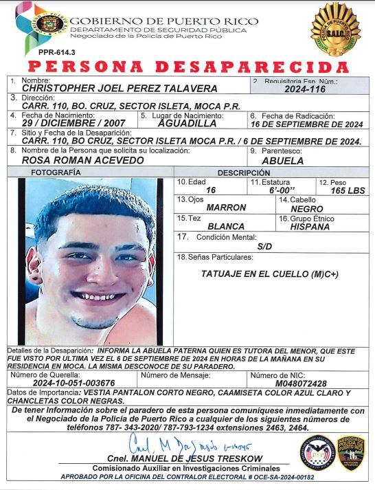 Según reportó su abuela paterna y tutora del mismo, el joven identificado como Christopher Joel Pérez Talavera, salió de su residencia el pasado viernes, 6 de septiembre de 2024, a eso de las 10:30 de la mañana y el mismo no ha regresado, desconociéndose hasta este momento su paradero.