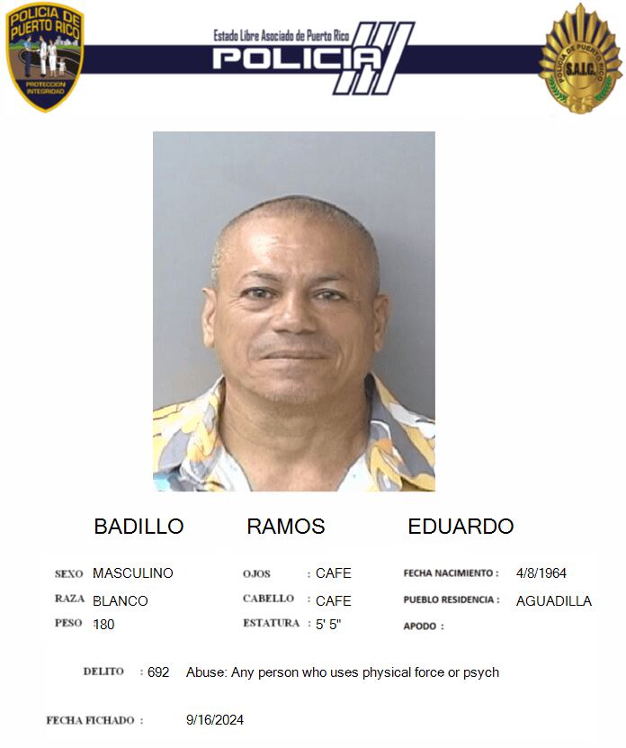 La Policía informó el lunes que agentes del Negociado de Inteligencia y Arrestos lograron el arresto de Eduardo Badillo Ramos, de 60 años, quien figuraba entre los 10 más buscados de Aguadilla.
