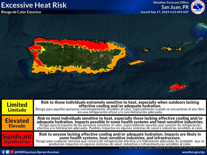 Se anticipan temperaturas cálidas, por lo que se ha emitido un aviso de calor excesivo para las áreas urbanas y de baja elevación del norte y oeste de Puerto Rico. Para el resto de las áreas costeras, incluidas Vieques, Culebra, se ha emitido una advertencia por calor en efecto desde las 10 AM hasta las 5 PM.