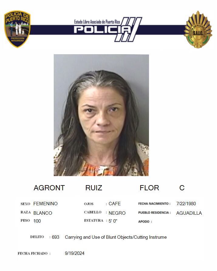 Personal del Negociado de Inteligencia y Arresto del área, durante la tarde del jueves, 19 de septiembre de 2024, arrestaron a una mujer, identificada como Flor C. Agront Ruiz, de 44 años y residente de Aguadilla, quien figuraba en la lista de los “10 más buscados” del área policiaca, contra esta pesaba una orden de arresto por tentativa de Asesinato y Ley de Armas, con una fianza global de $100 mil, expedida por el juez Orlando Avilés, del Tribunal de Aguadilla.