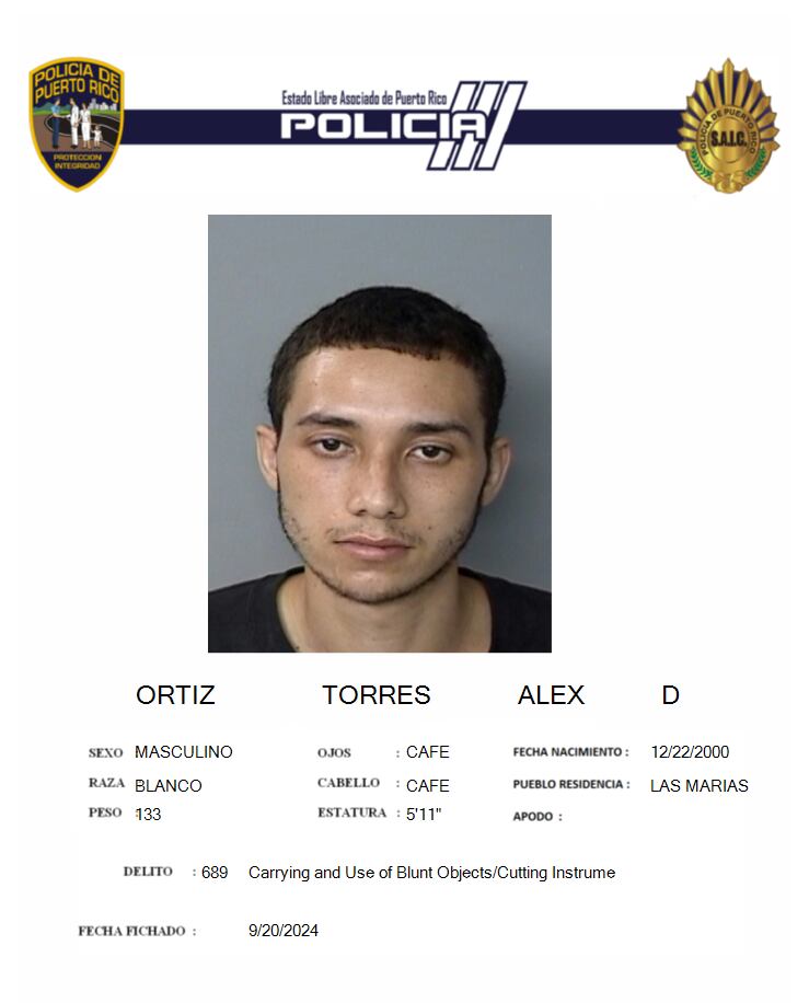 Agentes del Negociado de la Policía de Puerto Rico, en unión a la fiscalía de Mayagüez, durante la mañana del viernes, 20 de septiembre de 2024, informaron sobre la presentación de cargos criminales por tentativa de agresión, tentativa grave y Ley de Armas, contra un hombre, identificado como Alex D. Ortiz Torres, de 23 años de edad y residente de Las Marías.