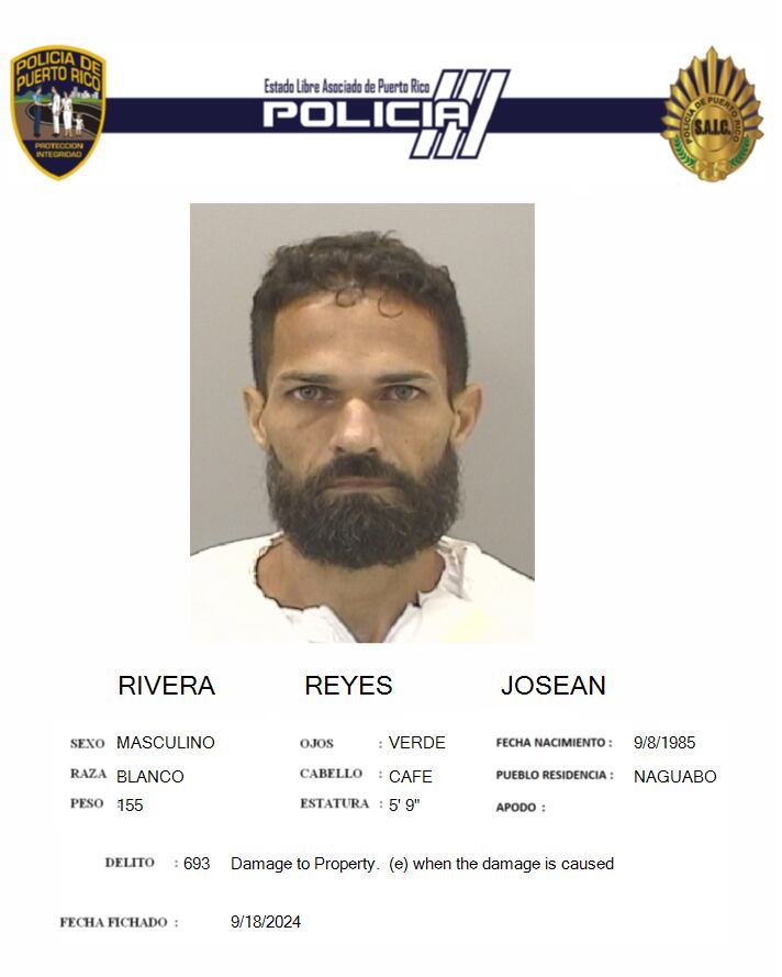 Agentes del Negociado de la Policía de Puerto Rico, adscritos a la División de Propiedad, Robo, Agresiones y Personas Desaparecidas del CIC de San Juan, informaron sobre la radicación de cargos, por parte de la Fiscalía, por daño grave a un vehículo oficial y obstrucción a la autoridad pública, contra un hombre, identificado como Josean Rivera Reyes, de 39 años y vecino de Naguabo.