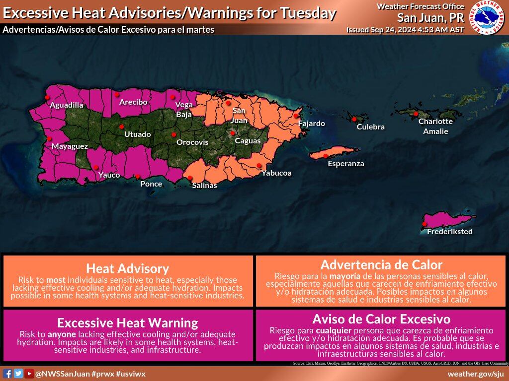 🥵Excessive Heat WARNING from Dorado to Aguadilla, extending through Santa Isabel & St. Croix. Heat ADVISORY from Toa Baja through Salinas &Vieques.#prwx #usviw pic.twitter.com/pilZTyZgux