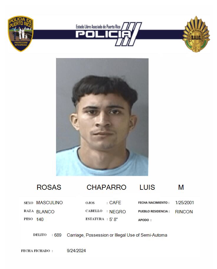 La Policía informó el martes sobre el arresto de Luis Miguel Rosas Chaparro, de 23 años, en la carretera 412, barrio Cruces de Rincón. Rosas Chaparro estaba en la lista de los 10 más buscados del área de Mayagüez.