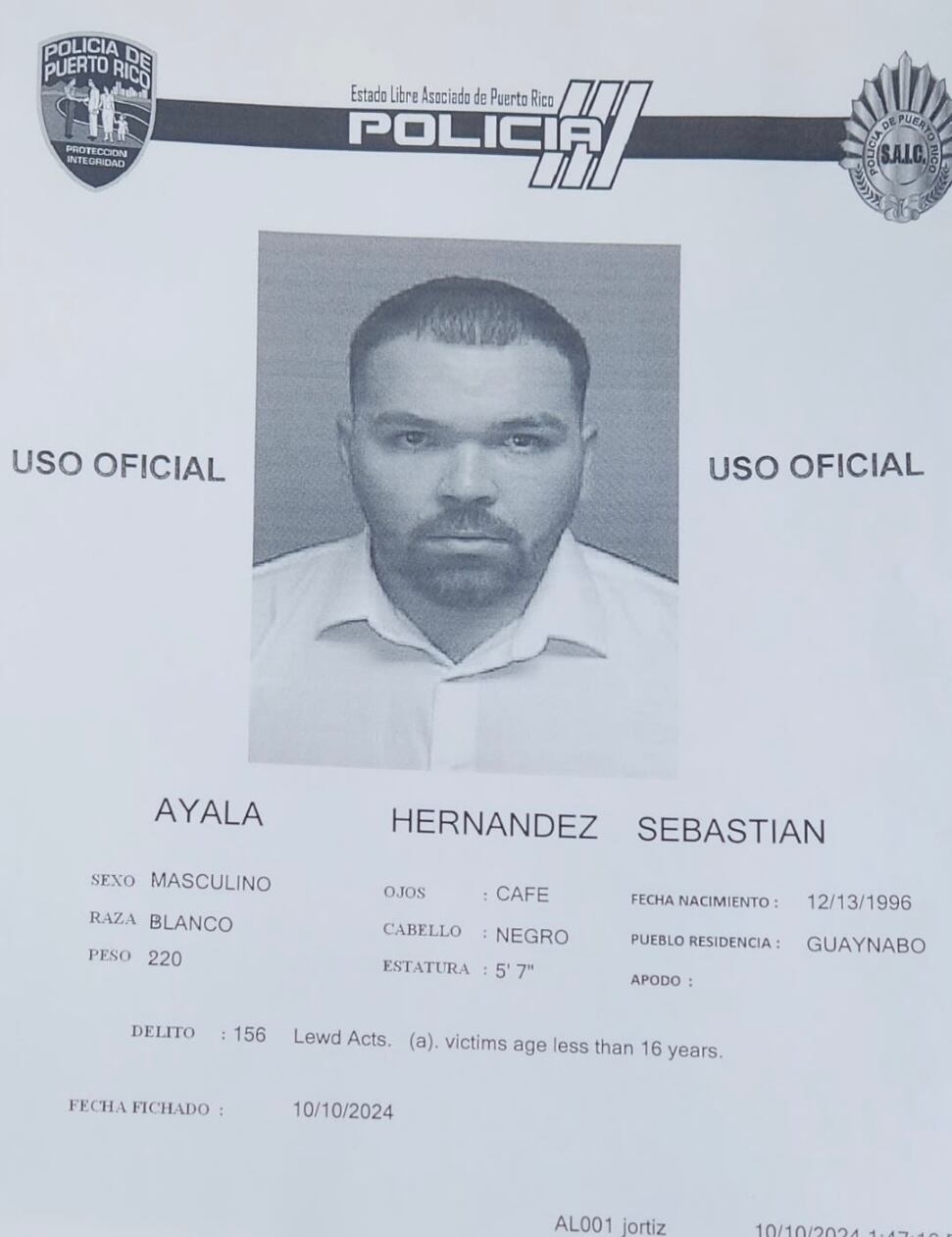En horas de la tarde de ayer, en el Tribunal de Bayamón le fueron radicados dos cargos criminales, por agresión sexual, (art. 130 (A) C/P, grave) y actos lascivos, (art.133 A, C/P, grave) a Sebastián Ayala Hernández de 27 años, residente en Guaynabo, contra una menor 16 años que en el momento de los hechos tenía 9 años, ocurridos en el municipio de Guaynabo.