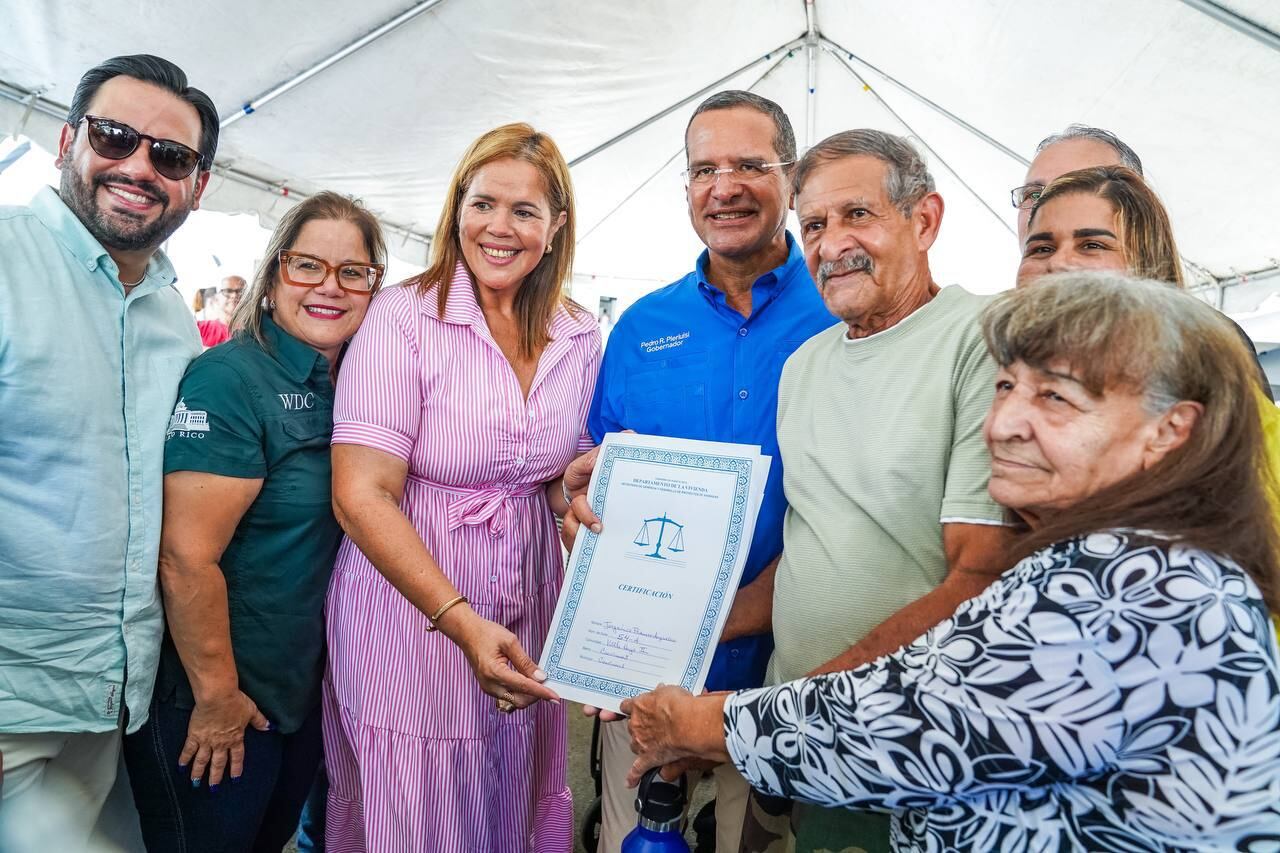 En un evento realizado en la comunidad Villa Hugo II, el gobernador junto al secretario del Departamento de la Vivienda, William Rodríguez Rodríguez, y la alcaldesa de Canóvanas, Lornna Soto Villanueva, entregaron títulos de propiedad a 56 residentes, representando un avance en el programa de Autorización de Títulos, financiado por los fondos de recuperación CDBG-DR.