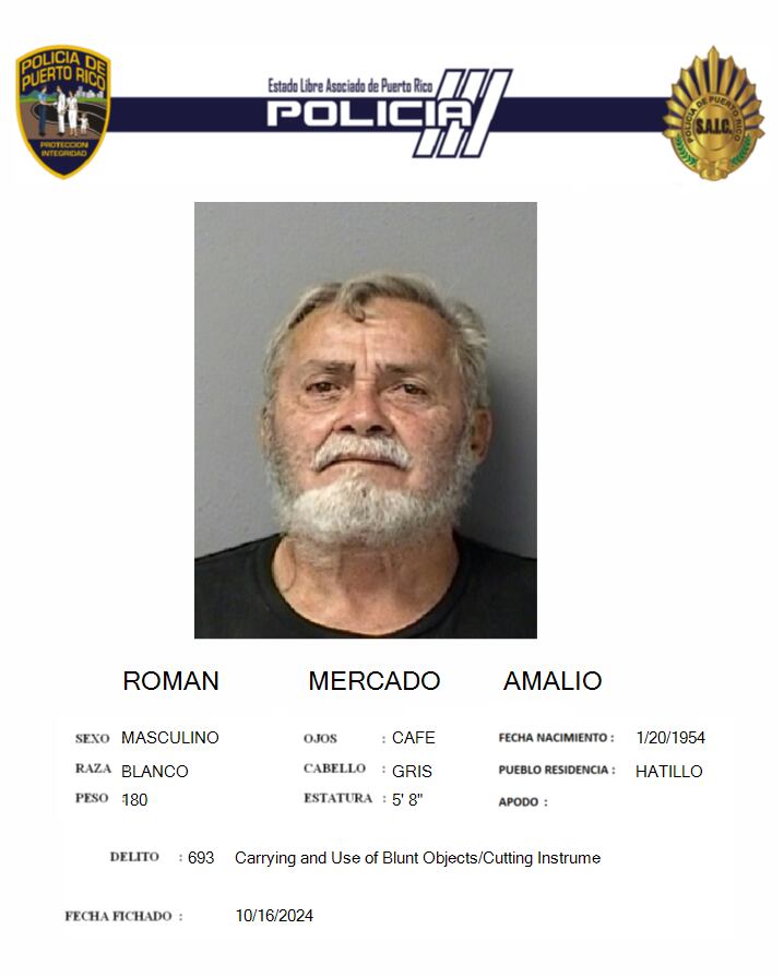 Las autoridades presentaron cargos criminales por los delitos de violación a la Ley de Armas (portación y uso de armas blanca), amenaza y agresión, contra un hombre, identificado como Amalio Román Mercado, de 70 años y residente de Hatillo.
