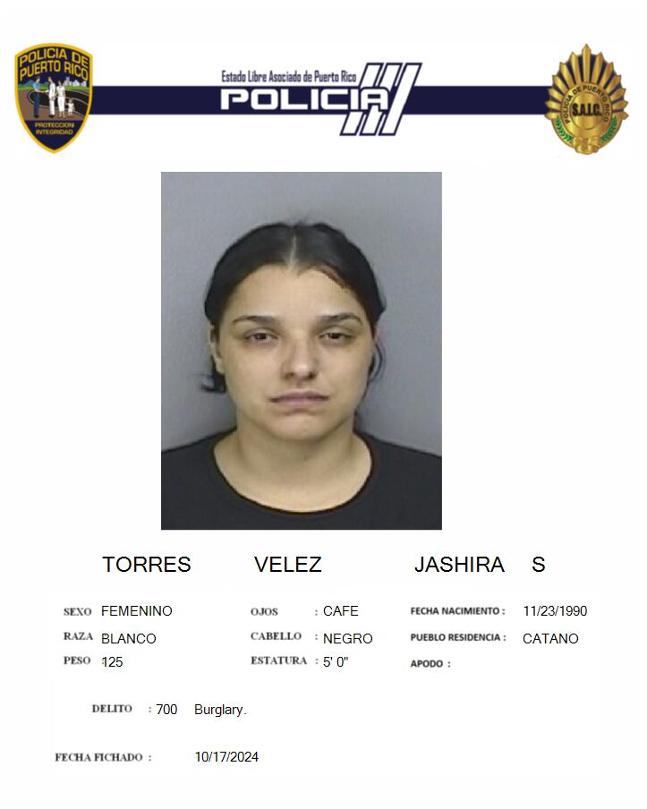 Las autoridades diligenciaron tres órdenes de arresto por escalamiento,(art. 194, 2C, C/P, grave), ratería de mercancía en establecimiento comercial, (art.184A, 2C, C/P, grave) y desacato criminal, (art. 279, C/P, M/G), contra una mujer, identificada como Jashira Shamil Torres Vélez, de 33 años y residente en Cataño, por hechos reportados el día 18 de junio de 2024, en la megatienda TJ MAXX, ubicada en el centro comercial Plaza Río Hondo, en el pueblo de Bayamón.