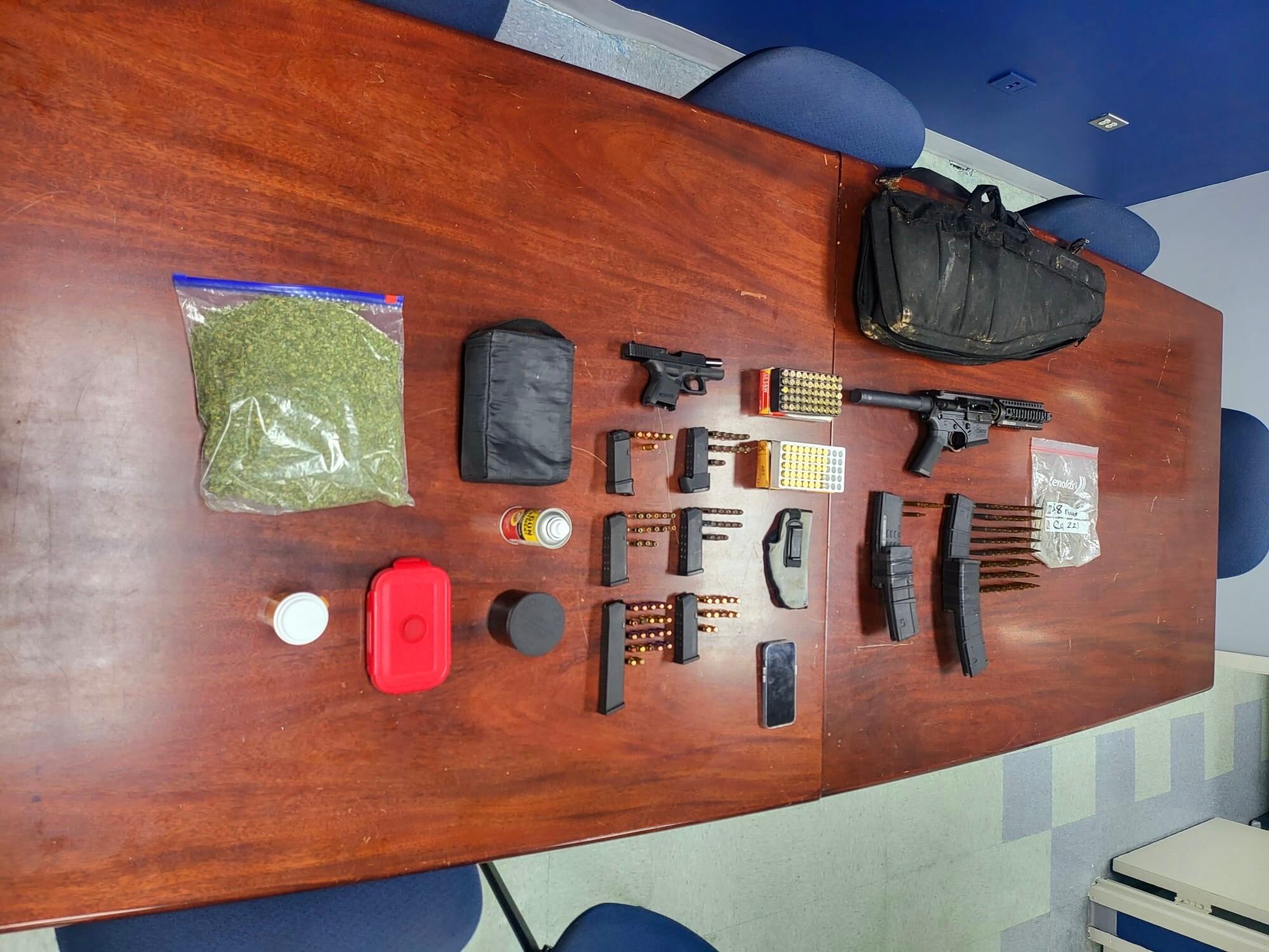 Durante el allanamiento, los agentes ocuparon una pistola Glock 27 calibre .40, 163 municiones .40, seis cargadores, un rifle multi-calibre, 124 municiones calibre .223, cuatro cargadores de rifle, marihuana y cocaína.