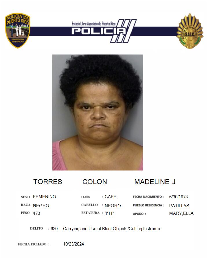 Agentes del Negociado de la Policía de Puerto Rico, adscritos a la División de Violencia de Género del Área de Guayama, presentaron cargos contra una mujer, identificada como Madeline Janet Torres Colón, de 52 años, en el Tribunal de Guayama.