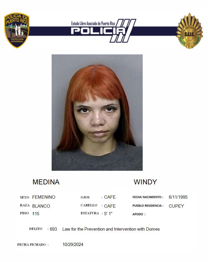 Agentes del Negociado de Inteligencias y Arrestos Especiales de la Policía de Puerto Rico del área de Bayamón, durante la tarde del martes, 29 de octubre de 2024, arrestaron a una mujer, identificada como Windy Medina, de 29 años y residente de la zona de Cupey, por hechos ocurridos el pasado 2 de octubre de 2024, en el área de un puente, en el municipio de Cataño.