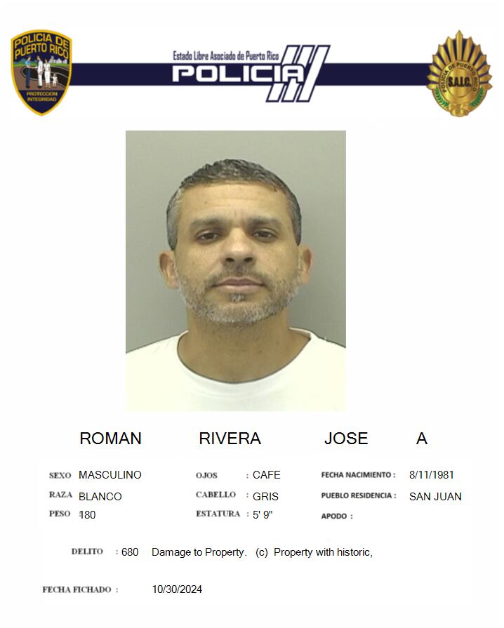 Agentes del Negociado de la Policía de Puerto Rico, adscritos a la División de Propiedad del CIC de San Juan, presentaron cargos criminales por daño agravado contra un hombre, identificado como José Alberto Román Rivera, de 43 años y vecino de San Juan.
