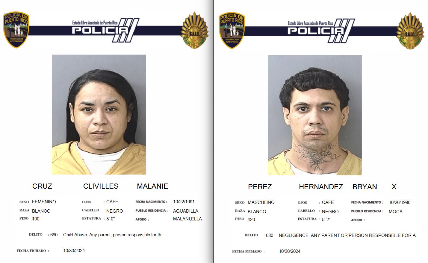 La Fiscalía local radicó cargos el miércoles, 30 de octubre de 2024, contra dos personas, identificadas como Bryan Pérez Hernández, de 27 años y residente de San Sebastián, y Melanie Cruz Clivilles, de 33 años y residente de Aguadilla, por la muerte de una menor, de 13 años, ocurrida en agosto de 2023.