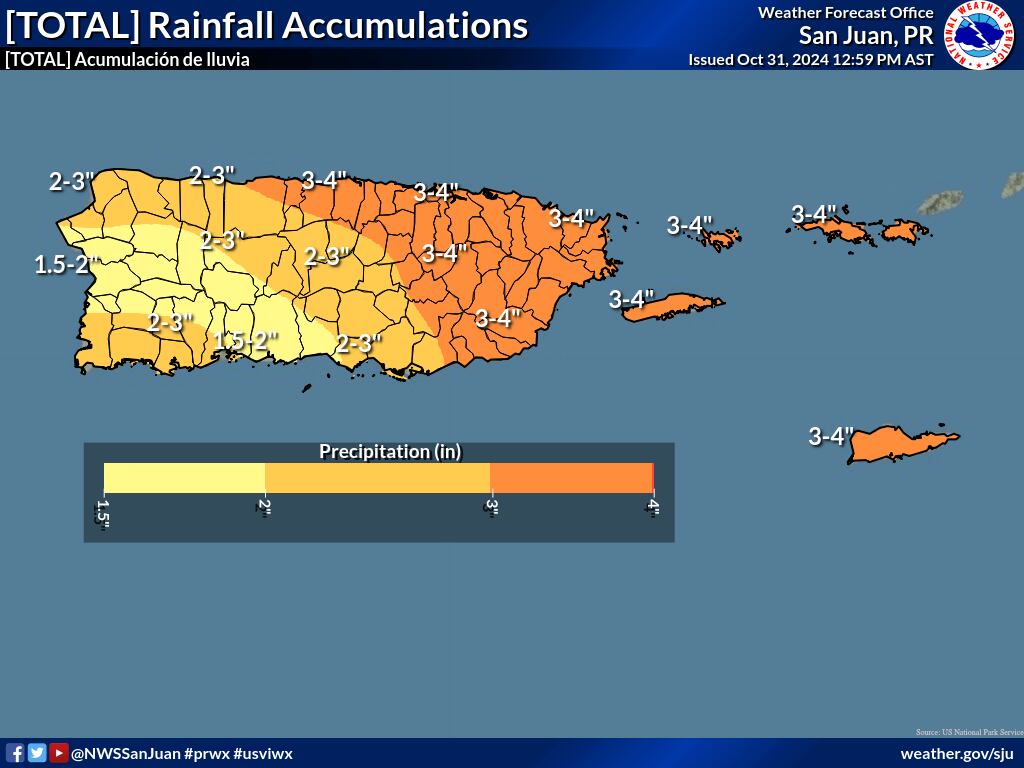 Se anticipa que las áreas del norte y este de Puerto Rico, así como Vieques, Culebra y las Islas Vírgenes, podrían recibir acumulaciones de lluvia de entre 3 a 4 pulgadas, con cantidades localmente superiores que podrían alcanzar hasta 6 pulgadas en algunas zonas. En el resto de la región, se espera una acumulación de lluvia de entre 1 y 3 pulgadas.