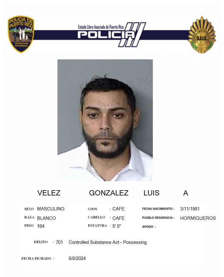 Agentes del Distrito de Hormigueros, adscritos al Negociado de la Policía de Puerto Rico, durante la madrugada del miércoles, 13 de noviembre de 2024, lograron el arresto de un hombre, identificado como Luis A. Vélez González, de 44 años y residente del dicho municipio. Contra este pesaba una orden de arresto en ausencia expedida el 11 de noviembre de 2024 por la jueza Sinia Pérez Correa por los artículos 2.8, 3.2 y 3.3 de la Ley 54 y el artículo 5.07 de la Ley 22 de la Ley Vehicular con una fianza global de $600 mil.