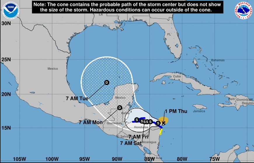 Se esperaba que la tormenta se estancara y deambulara cerca de la costa de Honduras durante el fin de semana, indicó el Centro Nacional de Huracanes de Estados Unidos. También se pronostican fuertes lluvias para Belice, El Salvador, el este de Guatemala y el oeste de Nicaragua.