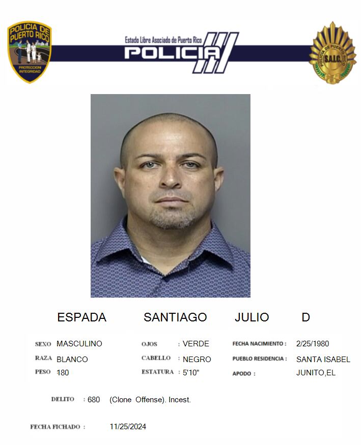 Las autoridades presentaron dos cargos por el artículo 131 (incesto), dos cargos por el artículo 133 A (actos lascivos), un cargo por el artículo 123 (corrupción de menores) del Código Penal y dos cargos por el artículo 53 B de la ley 57 de Ley para la Protección a los Menores, contra un hombre, identificado como Julio D. Espada Santiago, de 44 años y residente de Salinas, en el Tribunal de Guayama.