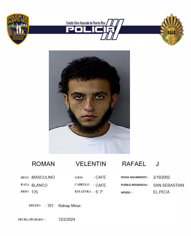 El Negociado de la Policía de Puerto Rico arrestó en horas de la mañana de hoy, lunes, a Rafael Román Valentín, alias “Peca”, el tercer sospechoso de secuestrar a un menor de 17 años en San Sebastián el viernes