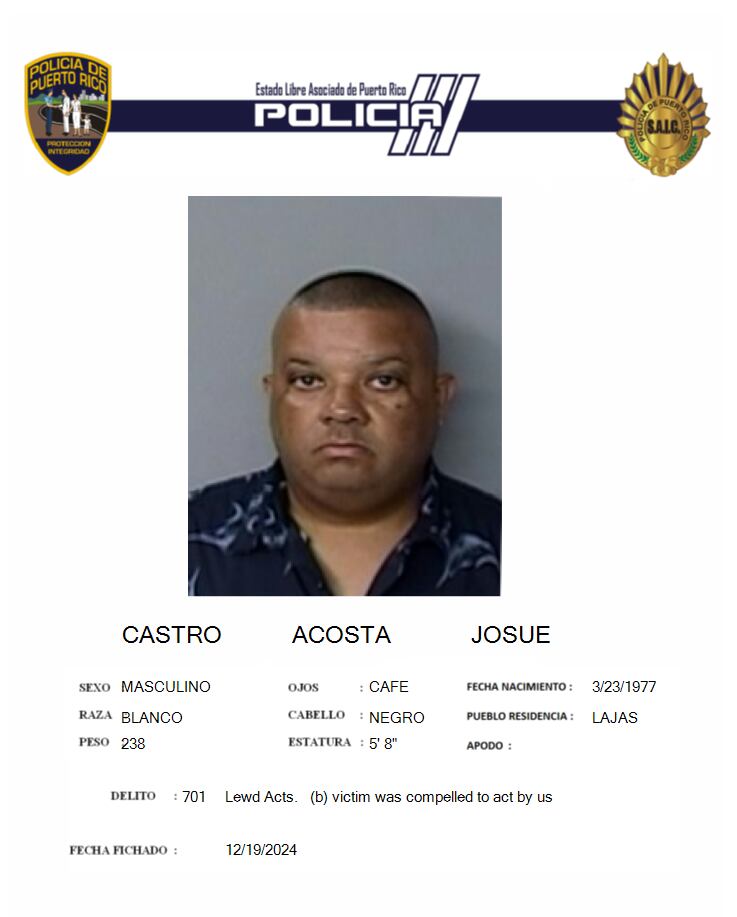 Cargos criminales por actos lascivos fueron radicado hoy, jueves, contra Josué Castro Acosta, de 47 años, quien labora como agente en el Negociado de la Policía de Puerto Rico.