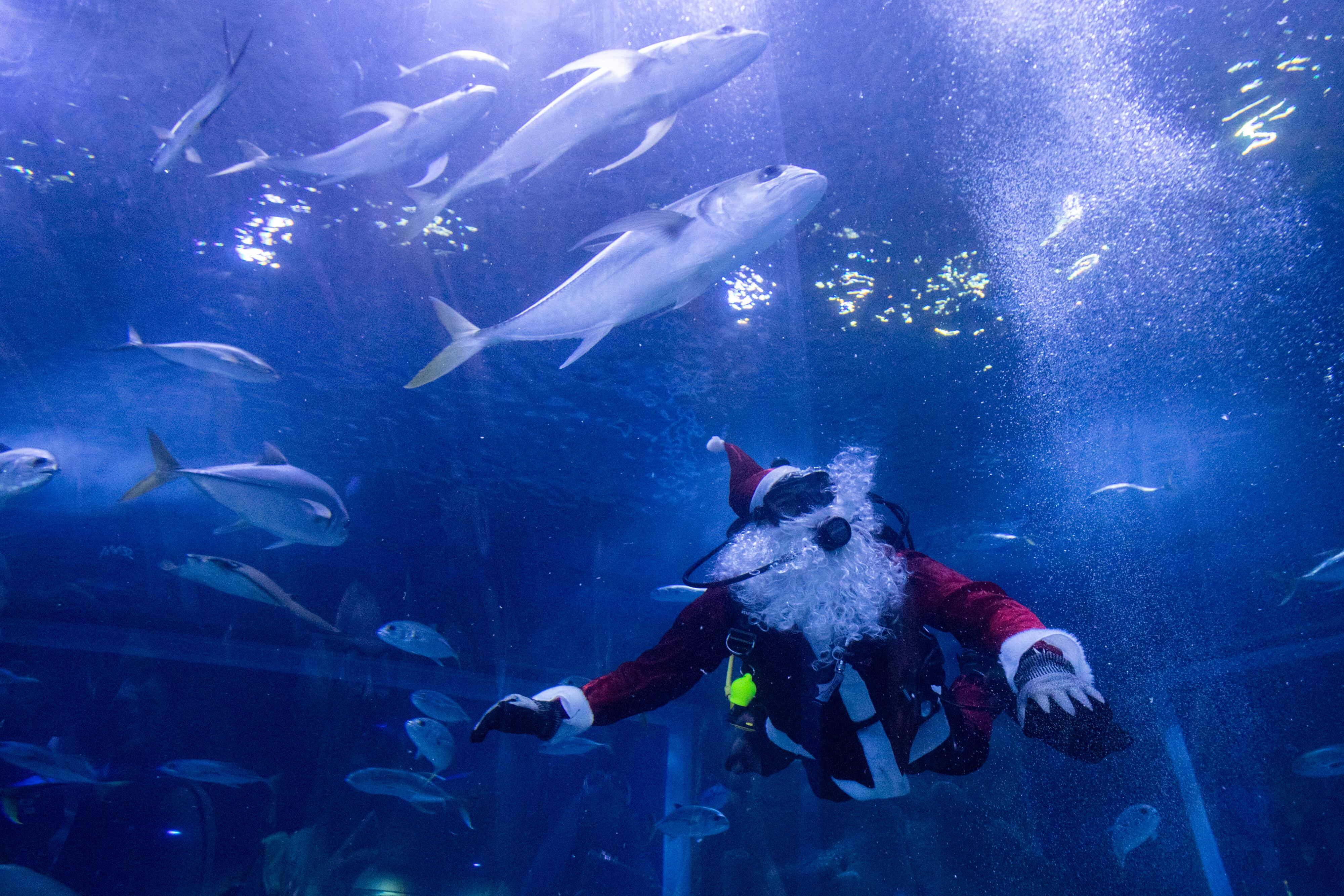Vestido de Santa, Luna se sumerge en el tanque del acuario de 3.500 metros cúbicos (924.602 galones) para alimentar a los animales marinos, incluidos los tiburones. “Para los niños, ver a Santa Claus bajo el agua ya es increíble. ¿Y Santa alimentando a un tiburón con la mano? Eso es inolvidable”, dijo Luna.