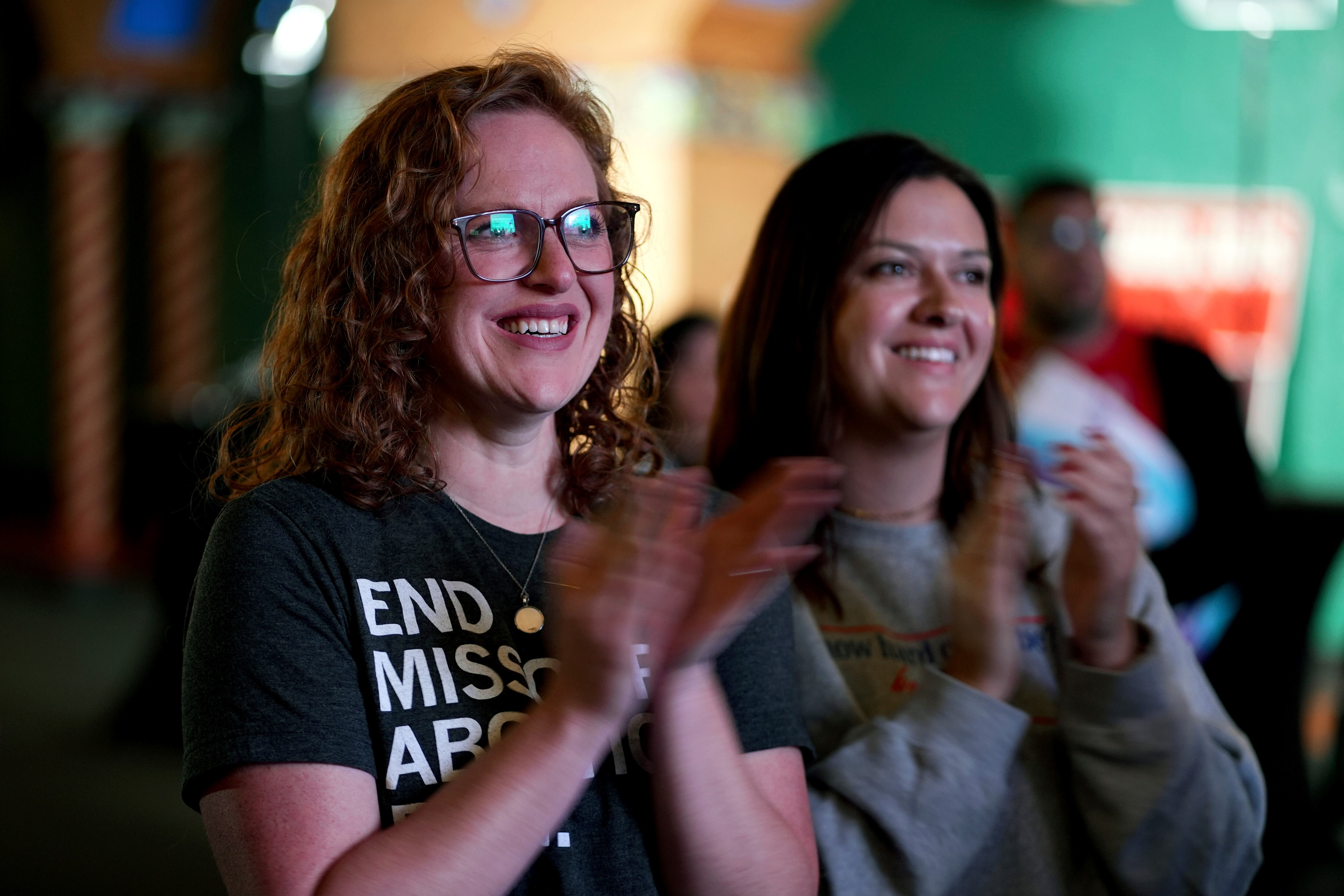 ARCHIVO – Erika, izquierda, y Leeann, que solo dieron sus nombres de pila, reaccionan tras la aprobación de una enmienda al derecho al aborto en la Constitución de Missouri, el martes 5 de noviembre de 2024, en una fiesta para ver el evento en Kansas AP (Charlie Riedel/AP)