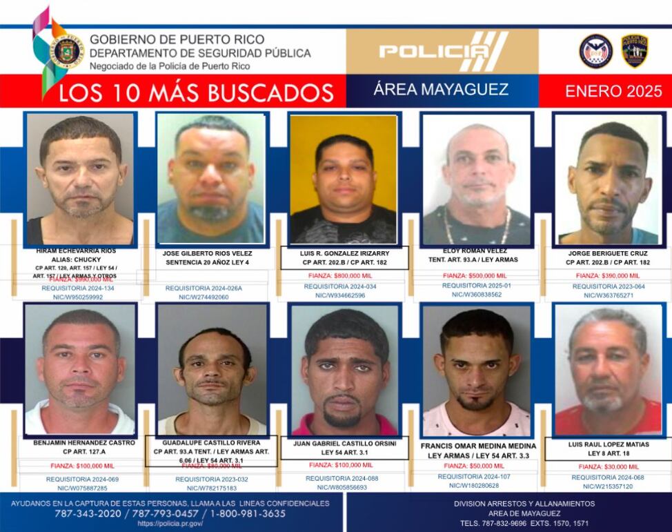 Agentes adscritos al Negociado de Inteligencia y Arrestos, de la Superintendencia Auxiliar en Operaciones Especiales (SAOE) del Negociado de la Policía de Puerto Rico (NPPR), actualizaron este viernes la lista de “Los Más Buscados” en el área de Mayagüez, acusados en su mayoría en ausencia por violaciones a la Ley de Armas, violaciones a la Ley 54, tentativa de asesinato, apropiación ilegal, entre otros delitos.
