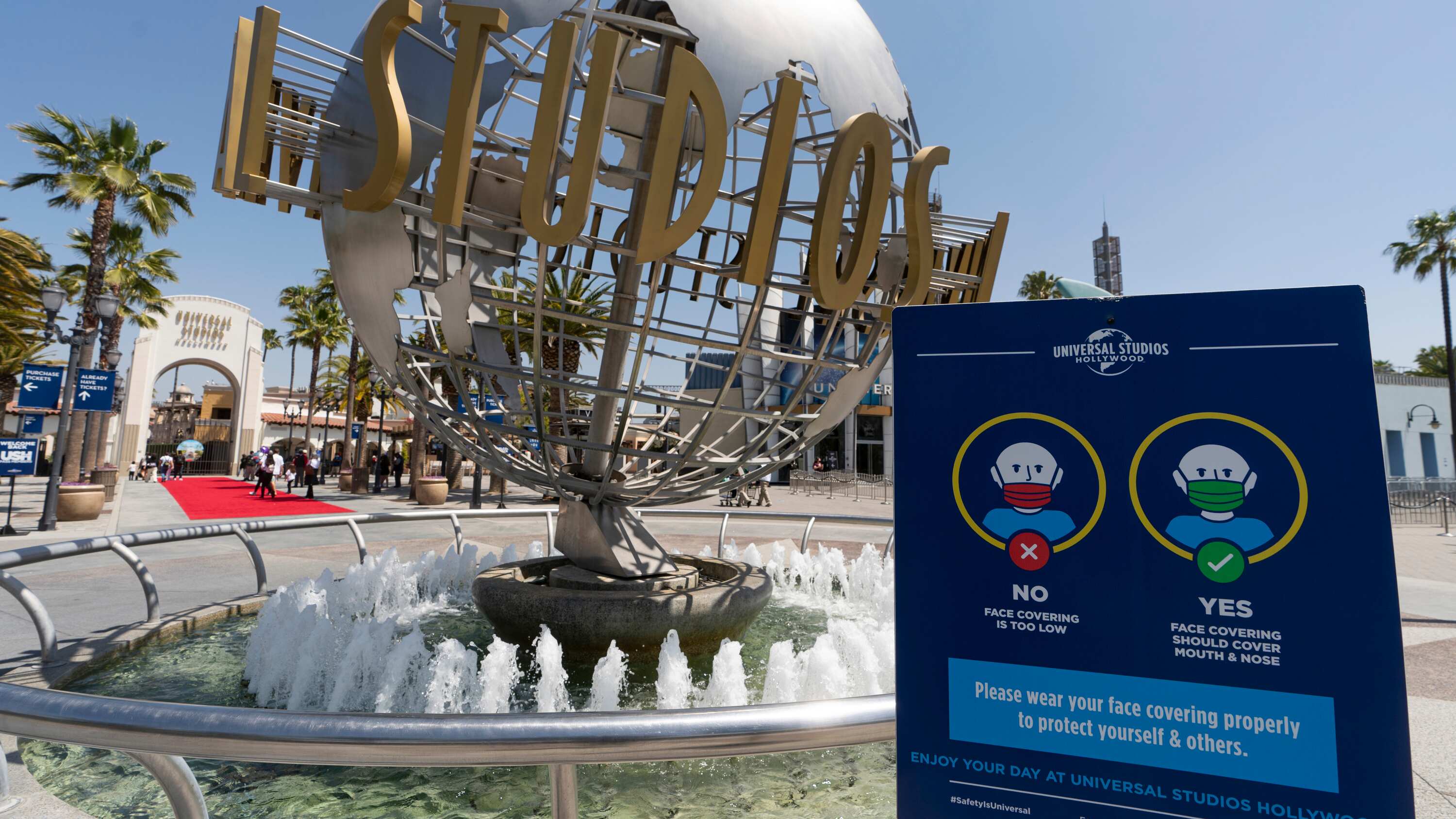 Entrada de los Universal Studios Hollywood con un letrero de los protocolos COVID-19 implementados en Los Ángeles, el 16 de abril de 2021. (Foto AP/Damián Dovarganes, Archivo) AP (Damian Dovarganes/AP)