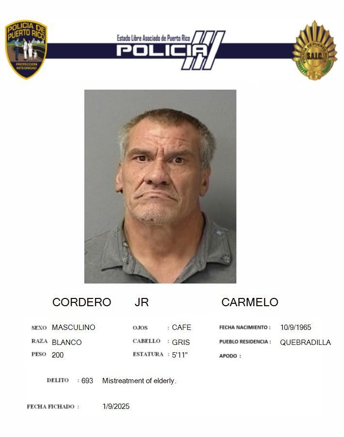 La Policía informó el viernes, 10 de enero de 2025, que un cargo por maltrato a persona de edad avanzada fue radicado contra Carmelo Cordero Jr., de 60 años y residente de Quebradillas, durante la tarde del jueves.