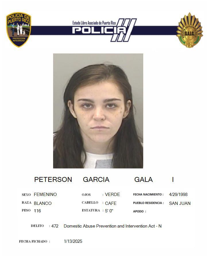 Agentes del Negociado de la Policía de Puerto Rico, adscritos a la División de Arrestos Especiales y Extradiciones, diligenciaron una orden de arresto, expedida el 9 de enero de 2025, con una fianza de $50 mil, por violación al artículo 2.8 (Incumplimiento de Órdenes de Protección) bajo la Ley para la Prevención e Intervención con la Violencia Doméstica conocida como Ley 54, contra una mujer, identificada como Gala I. Peterson García, de 26 años y residente de San Juan.