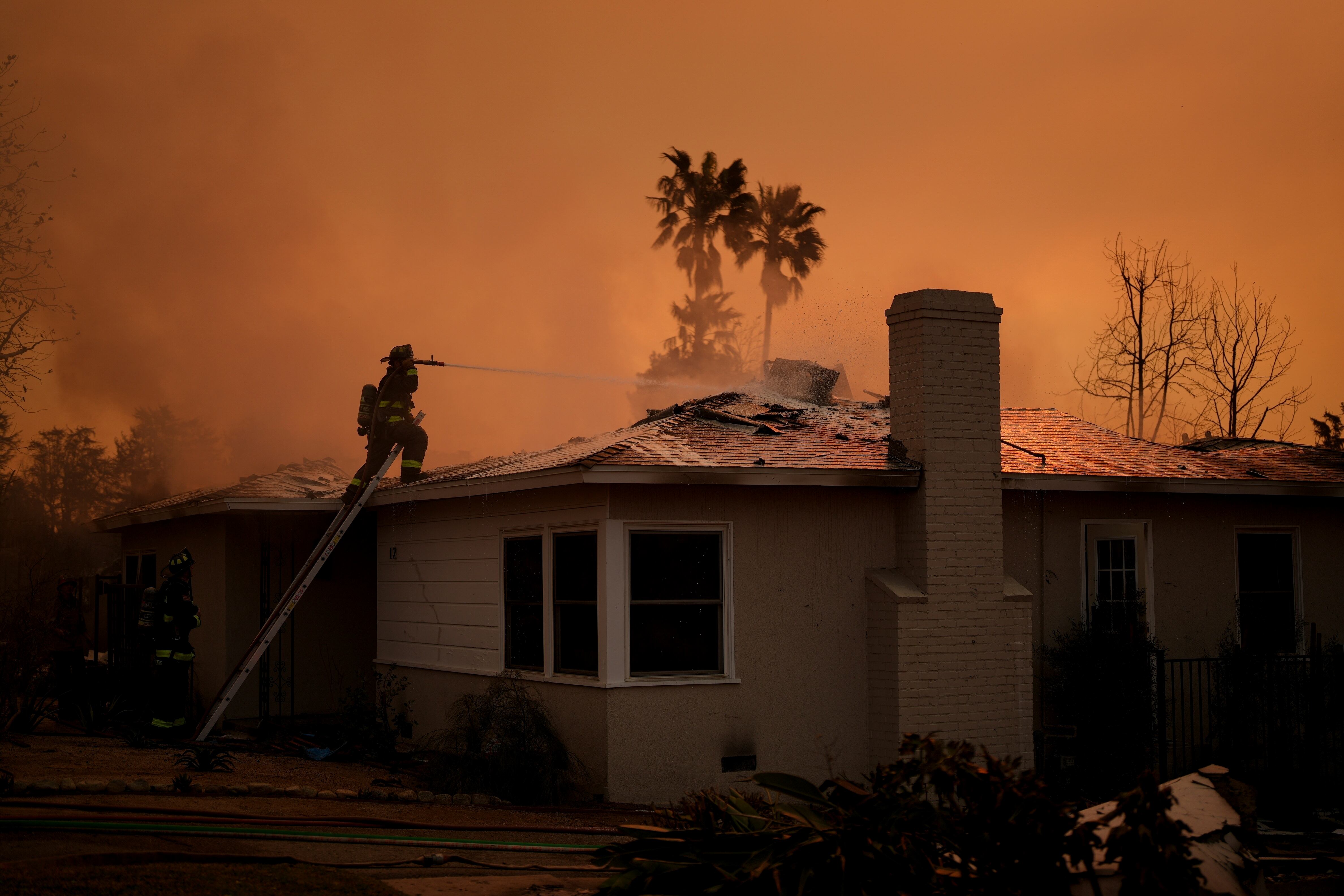 Equipos de bomberos luchan contra el incendio de Eaton mientras afecta a una casa el jueves, 9 de enero de 2025, en Altadena, California. (AP foto/Eric Thayer) AP (Eric Thayer/AP)