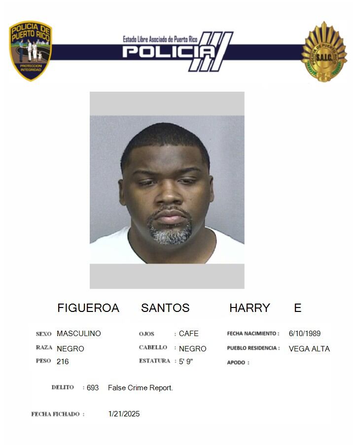 Agentes, adscritos al Negociado de Inteligencia y Arrestos Especiales de la Policía de Puerto Rico, del área de Bayamón, diligenciaron una orden de arresto contra un hombre, identificado como Harry Enrique Figueroa Santos, de 35 años, quien se encuentra sumariado en el Complejo Correccional de Bayamón. La dicha orden fue expedida por violentar al Código Penal de Puerto Rico luego de hacer declaración o alegación falsa (art.268), en hechos ocurridos durante el mes de agosto de 2024, en la División de Vehículos Hurtados de Arecibo.