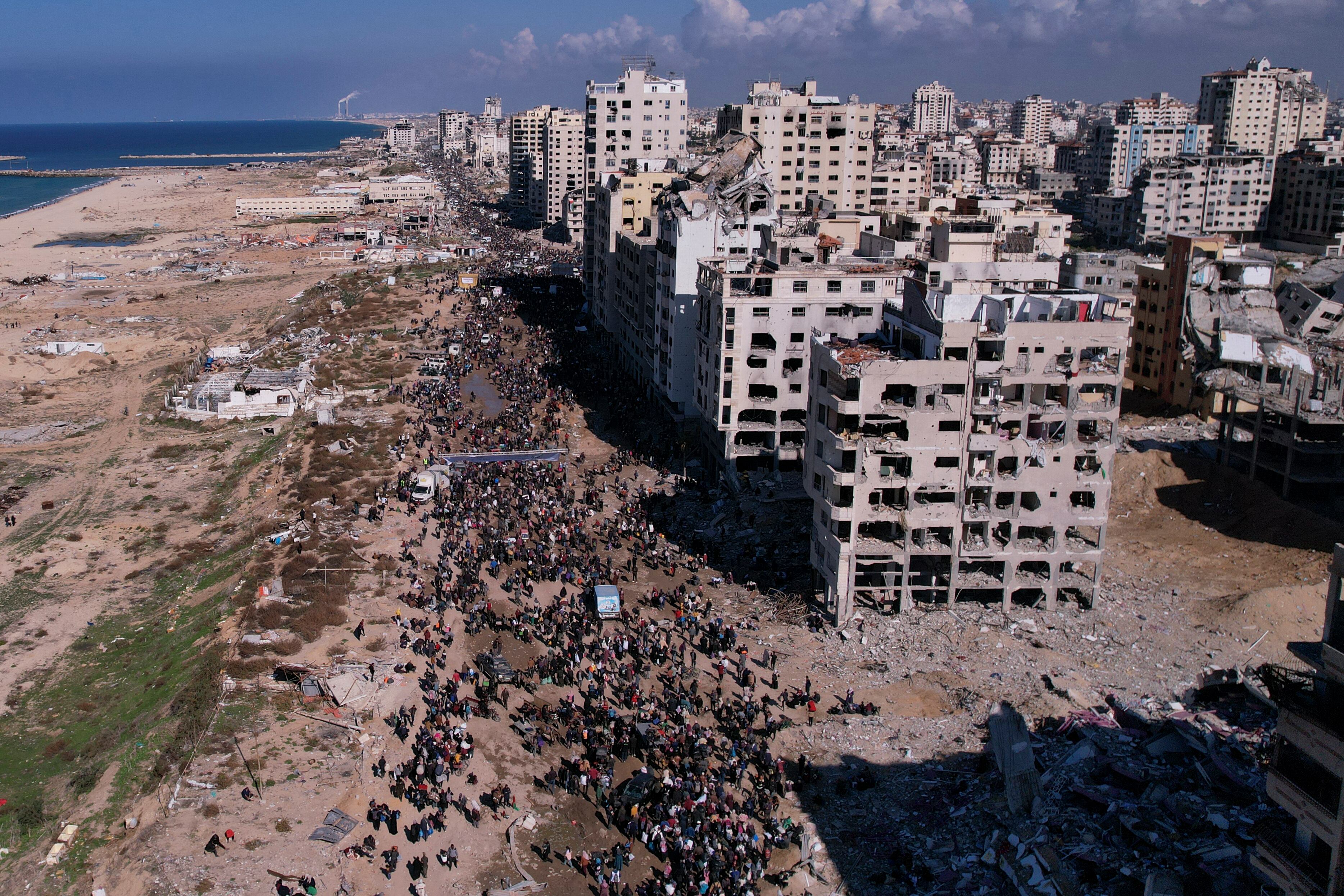 Las fotos, videos y grabaciones de drones de The Associated Press muestran a decenas de miles avanzando a pie por la carretera. A un lado estaba el mar Mediterráneo; al otro, se extendía un paisaje de edificios destruidos y tierras arrasadas dejadas por las fuerzas israelíes en retirada.