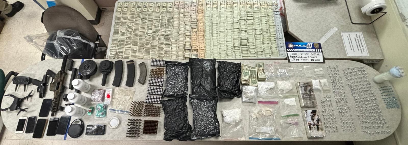 Las autoridades ocuparon dos armas de fuego (pistola y rifle), 2 kilos de cocaína, 5 libras de cocaína, 502 municiones de diferentes calibres, 1 bolas de cocaína rosa (tusi), 413 decks de heroína, 14 bolsas grades de cocaína, 8 cargadores de diferentes calibres, y 14,910.00 dólares en efectivo.