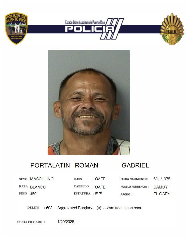 Agentes, adscritos a la División Delito contra la Propiedad del área de Arecibo, llevó a cabo una investigación que culminó por parte de la fiscalía, con la presentación de cargos por los delitos de escalamiento y apropiación ilegal, durante la tarde del miércoles, 29 de enero de 2025, contra un hombre, identificado como Gabriel Portalatín Román, conocido como “Gaby”, de 49 años y residente del pueblo de Camuy.