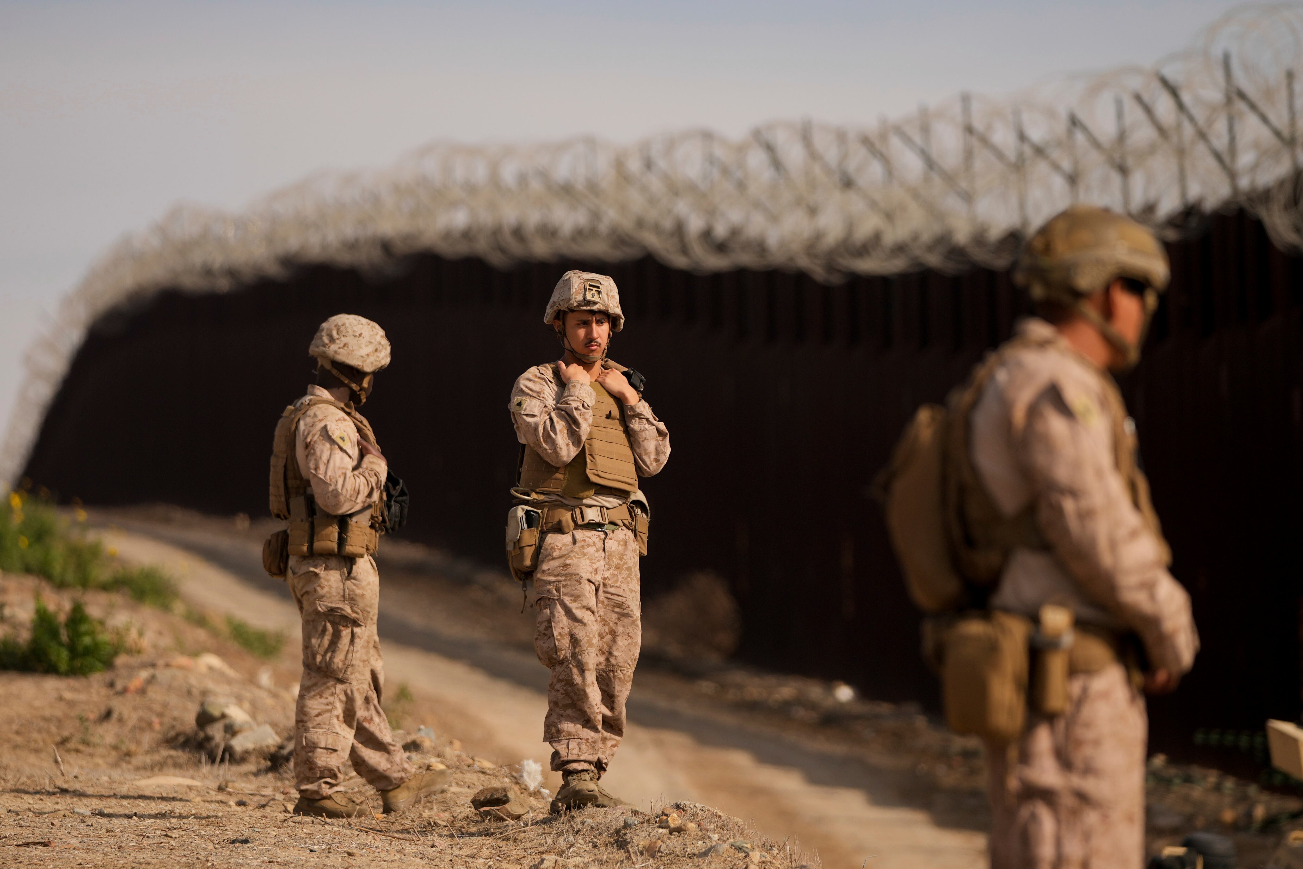 Hasta ahora, el ejército ha mantenido una baja visibilidad en San Diego. Los marines colocaron alambre de púas el viernes en la base de un muro fronterizo de 5.5 metros (18 pies) de altura que ya tenía alambre en la parte superior. Los migrantes que logran pasar por encima o a través del alambre se enfrentan a un segundo muro de 9.1 metros (30 pies) de altura.