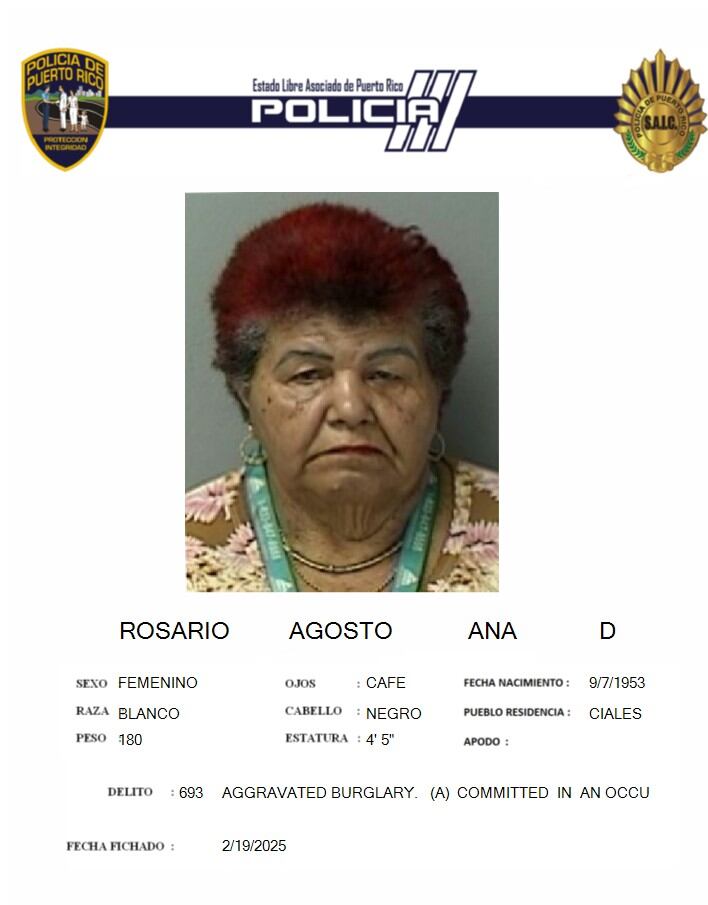 De acuerdo a la Uniformada, para los meses de diciembre de 2024 y enero de 2025, la mujer, identificada como Ana D. Rosario Agosto, de 71 años y residente del pueblo de Ciales, se apropió ilegalmente de prendas, equipo electrónico y generador eléctrico de dos apartamentos, ubicados en el Condominio Park Hills, en el pueblo de Manatí.