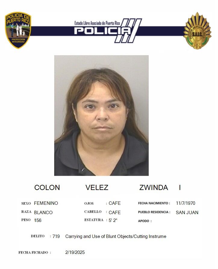 Agentes del Negociado de la Policía de Puerto Rico, adscritos al Precinto de Calle Loíza y Turística San Juan, realizaron una investigación que terminó en la presentación de cargos criminales por parte de la Fiscalía por Portación y Uso de Armas Blancas (art. 6.06) de la Ley de Armas de Puerto Rico contra una mujer, identificada como Zwinda I. Colón Vélez, de 54 años y vecina de San Juan.