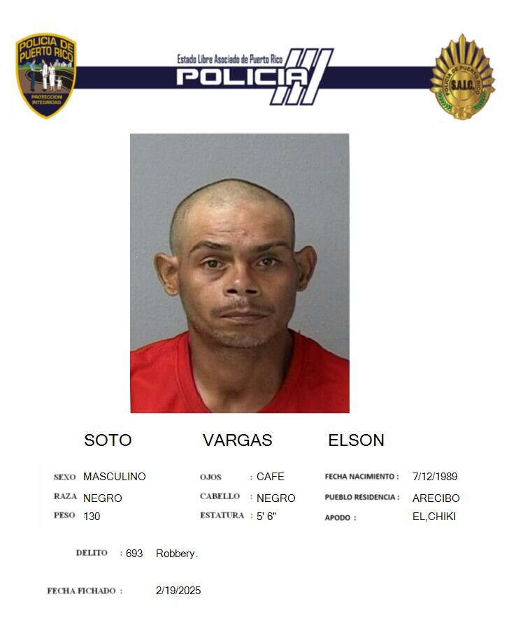 De acuerdo a la Uniformada, para la fecha del 15 de febrero de 2025, a eso del mediodía en la carretera PR-129, intersección con la Avenida Constitución del pueblo de Arecibo, se encontraba Elson Soto Vargas, de 35 años, se le acercó al vehículo Toyota Rav 4, que estaba detenido en un semáforo y su conductor, identificado como una persona de edad avanzada, de 79 años, bajó el cristal del auto para darle un $1 y el sujeto aprovechó y le arrebató 41 dólares en efectivo.