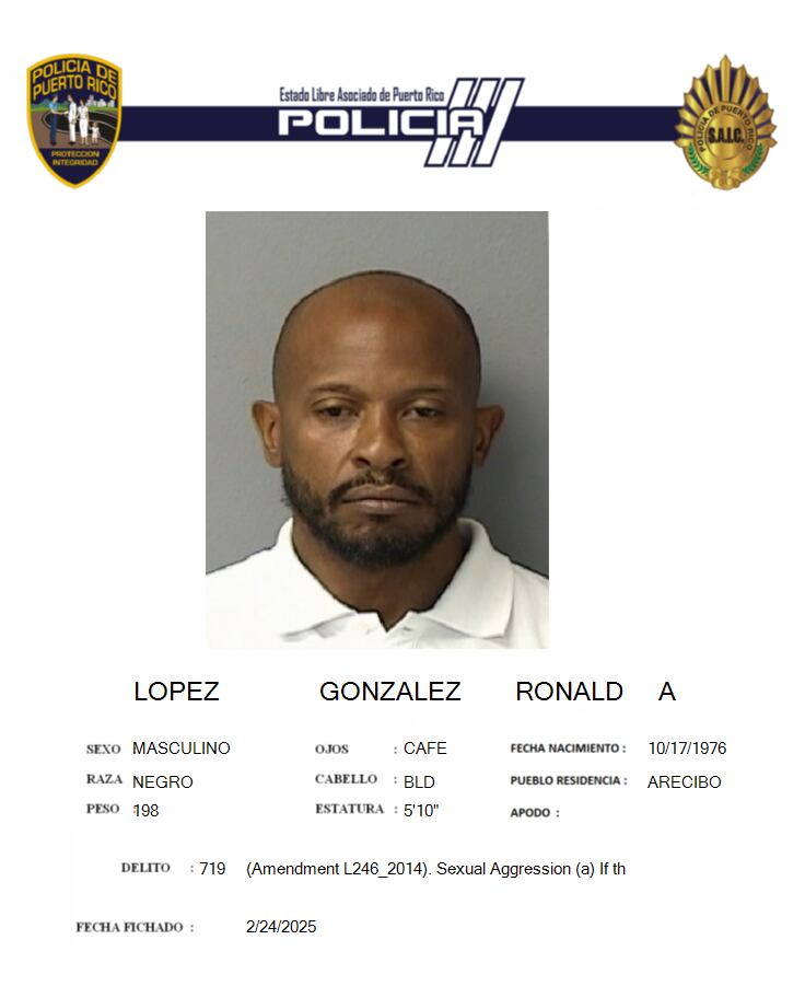 De acuerdo a la Uniformada, para la fecha del 19 y 20 de julio de 2024, un hombre, identificado como Ronald A. López González, de 47 años y residente de Arecibo, cometió alegadamente agresión sexual contra una menor, de 15 años de edad, en el gimnasio Old School Gym By Ronald, ubicado en el pueblo de Hatillo.